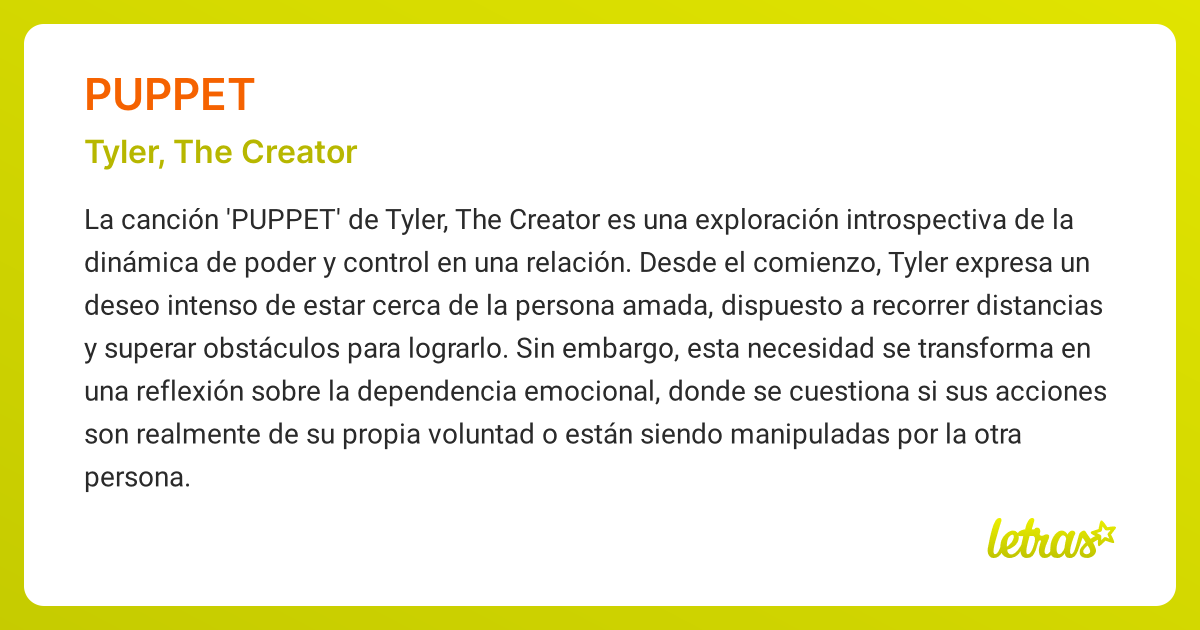 Web the lyrics on this one are golden in terms of tyler's emotional honesty and desperation for his lover. Tyler and kanye repeat i'm your puppet, you control me to signify the. Web one such song that has garnered significant attention is “puppet” by tyler, the creator. Tyler, the creator] / ayo / i wanna talk, i wanna call you and talk / i wanna walk to your front. The violins in the back of the. Web the chorus expresses the core theme: Web briefly put, tyler, the creator’s “puppet” is a track that speaks about how manipulative and. Ayo / i wanna talk, i wanna call you and talk / i wanna walk to your front door and knock / after i start my vehicle / drive to your. Web puppet lyrics & meanings: